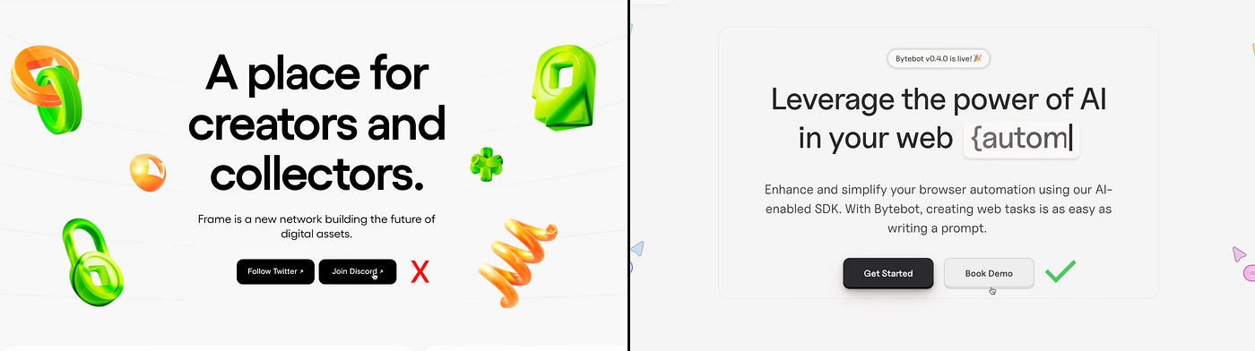 Don’t forget the hierarchy of the CTAs 🚨. CTA stands for call to action, which is the part of the website where the user is asked to take an action. If that section has several buttons to press, they must have a hierarchy.